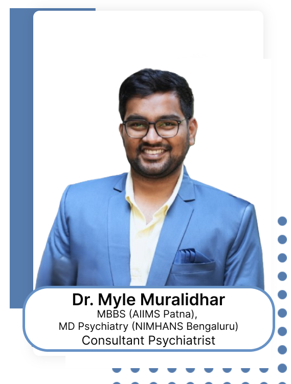 Dr. Myle Muralidhar is a highly skilled and compassionate psychiatrist with a commitment to delivering innovative, patient-centered mental health care. With an academic foundation from two of India’s premier institutions—AIIMS Patna and NIMHANS Bengaluru—Dr. Muralidhar brings a wealth of expertise and a deep understanding of mental health complexities.